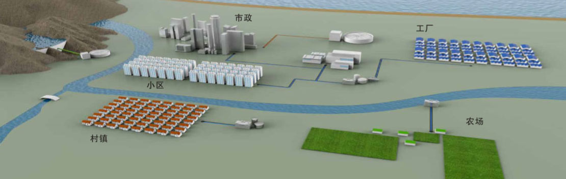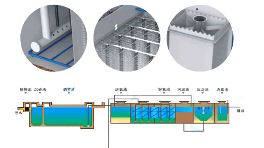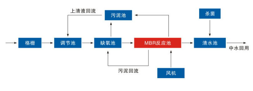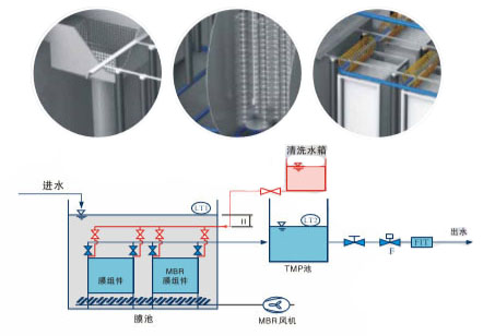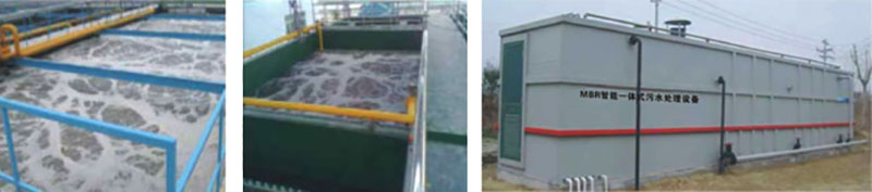 MBR是一种将高效膜分离技术与传统活性污泥法相结合的新型高效污水处理工艺,它用具有独特结构的浸没式膜组件置于曝气池中,经过好氧曝气和生物处理后的水,由抽吸泵通过膜过滤后抽出。它与传统污水处理方法具有很大区别,取代了传统生化工艺中二沉池和三级处理工艺,由于膜的存在大大提高了系统固液分离的能力,从而使系统出水水质和容积负荷都得到大幅度提高,结合不同的工艺,出水可以达到景观用水或杂用水标准。由于膜的过滤作用,微生物被完全截留在生物反应器中,实现了水力停留时间与活性污泥泥龄的彻底分离,消除了传统活性污泥法中污泥膨胀问题。膜生物反应器具有对污染物去除效率高、硝化能力强,可同时进行硝化、反硝化、脱氟效果好、出水水质稳定、剩余污泥产量低、设备紧凑、操作简单等优点。目前广泛应用于生活、医疗污水的处理及回用。