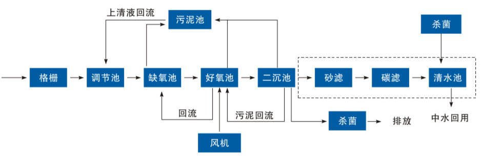 生物水解酸化和接触氧化工艺:是一种简单有效的水处理工艺,流程简单,构筑物少,只有一个污泥回流系统和混合液回流系统,基建费用省;反硝化池不需外加碳源,降低了运行费用;好氧池在缺氧池之后可使反硝化残留的有机物得到进一步去除,提高出水水质;缺氧池在前,污水中的有机碳可被反硝化菌利用,可减轻好氧池的有机负荷。脱氮效率不高,一般为70-80%,且沉淀池内易发生污泥上浮,使出水水质恶化。